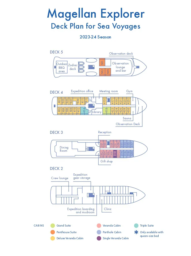 Accommodating up to 73 guests across seven categories, Magellan Explorer for air-cruises includes dedicated single cabins. Private balconies grace all cabins, excluding Porthole Cabins. Most double cabins offer the flexibility of configuring twin beds into a king-size arrangement. Each accommodation is equipped with a wardrobe, individually controlled heating, a cozy sitting area, and a private bathroom featuring a shower and heated floors.