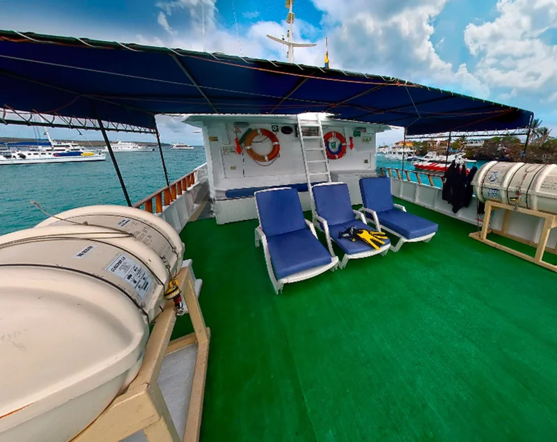 The Darwin yacht also offers a spacious sundeck, a well stocked bar, a cozy living room and a pristine dining room where guests can enjoy well planned international and Ecuadorian cuisine. The Darwin follows carefully designed itineraries that allows the eager visitor to enjoy a fantastic adventure at a very reasonable cost, which makes it and excellent option for travelers looking for an affordable, yet complete Galapagos adventure.