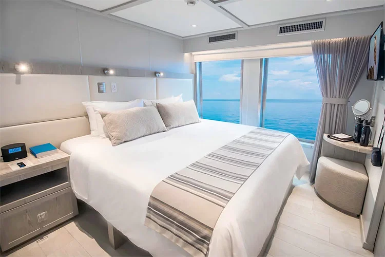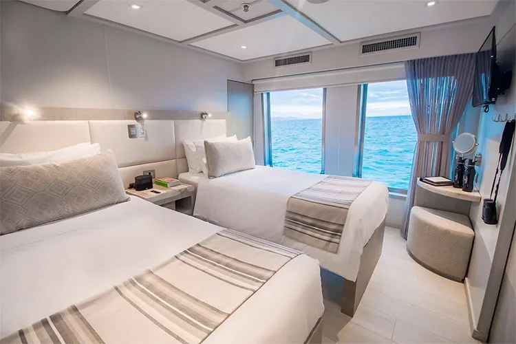 The cabins are equipped with modern showers with views of the ocean, dual-flush toilets, slippers, hair dryers, biodegradable hand soap, body wash, shampoo and conditioner. The cabins are equipped with plush towels, waffle robes, slippers and hair dryers. They also include biodegradable soaps and shampoos and conditioners. A vanity area with a stool, mirror and light is also available. Other amenities include an Apple TV preloaded with movies, universal docking stations, and safe deposit boxes. The cabins are clean twice daily and there is a laundry service available. Each cabin is equipped with a teakettle and an Espresso machine. The main deck (Beagle Deck) is where all staterooms can be found.